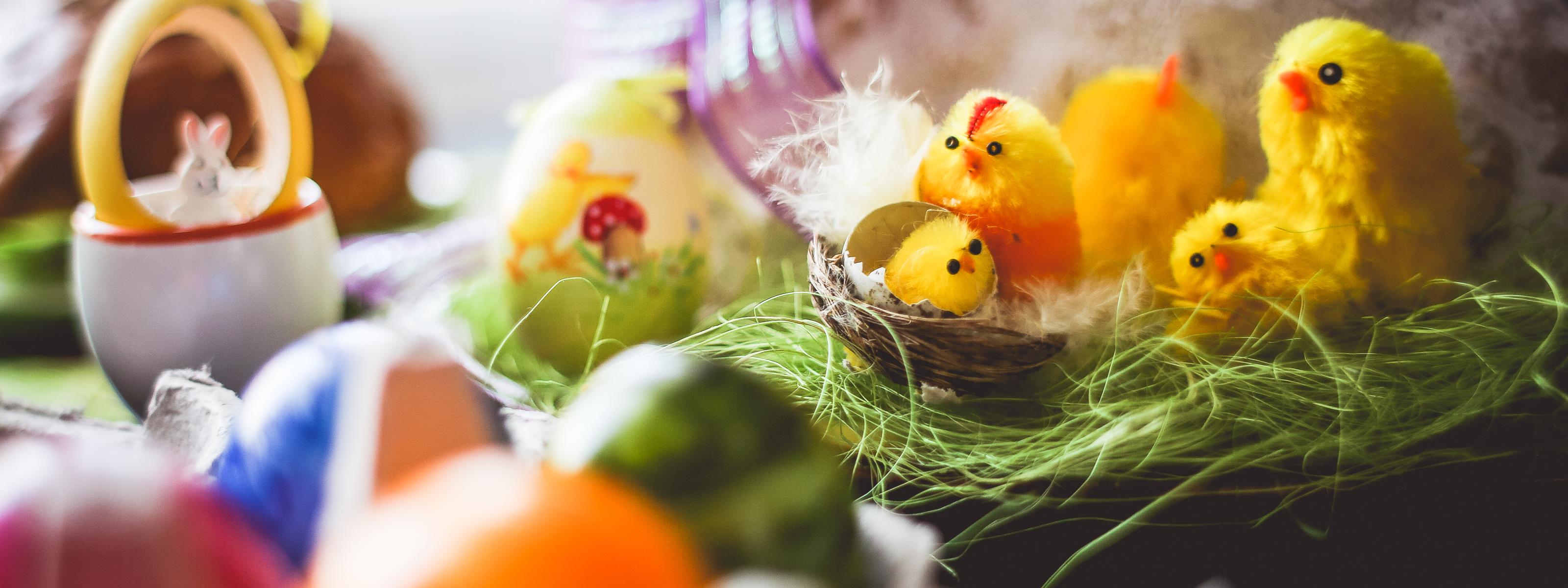 Colorful Easter Decorations Wallpaper, 3200x1200 Resolution.